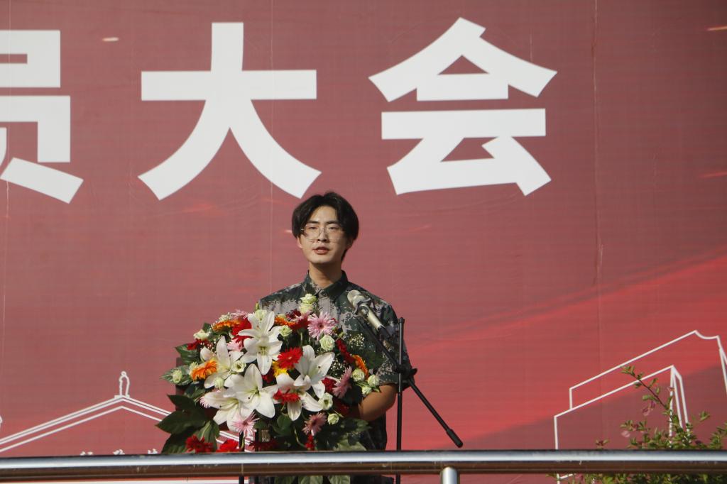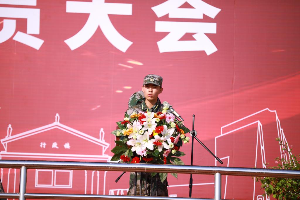 军训团教官代表喻祖逖承训教官发言,他讲话中表达了能够承担此次军训任务的自豪感和荣誉感,并代表全体军训团教官承诺一定会以身作则,严格要求,带领新生同学们掌握一定的军事技能,养成军人作风和高尚的道德情操。