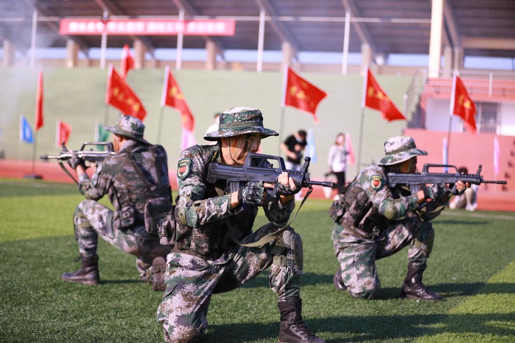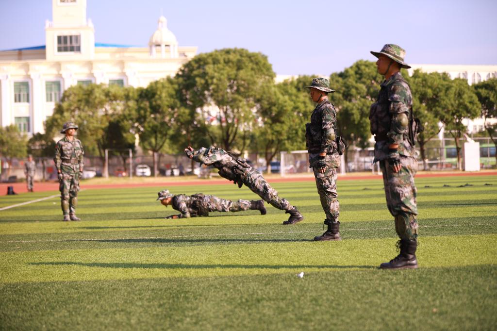 英姿飒爽的军训教官技能展示环节,每位教官之间都十分默契的操演,从站军姿到匍匐前行,摔擒、倒功,每个动作都标准到位,赢得全场阵阵喝彩。