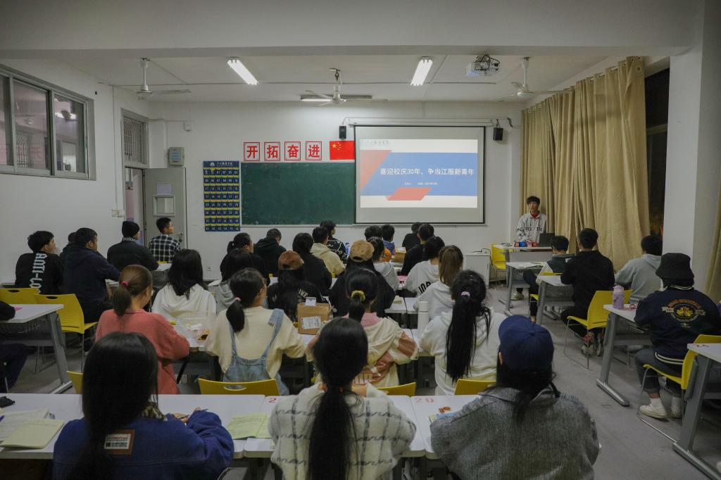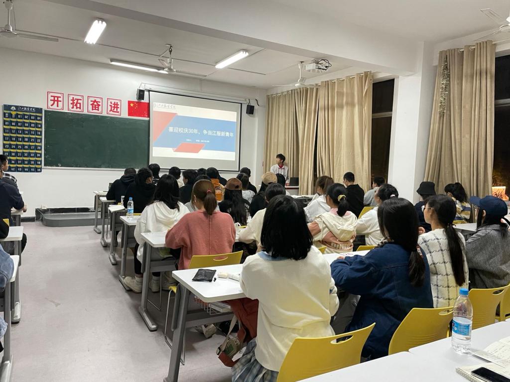 (新闻中心讯)为迎接建校30周年,加深同学们对校史、校情、校训的了解,激发全体同学对学校的归属感、认同感和自豪感,切实强化学生爱校荣校意识。10月24日晚,我校412个班级共同开展“喜迎校庆30年,争当江服新青年”主题班会活动,主题班会从观看“时尚新征程,聚力再出发”校庆30周年宣传片,校史校情解读,宣读“庆三十华诞 展江服风采”校庆倡议书及唱颂校歌《书写华章,织就辉煌》等四部分展开。