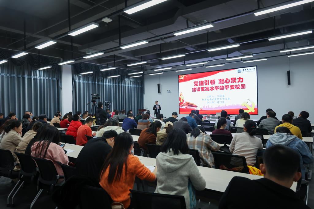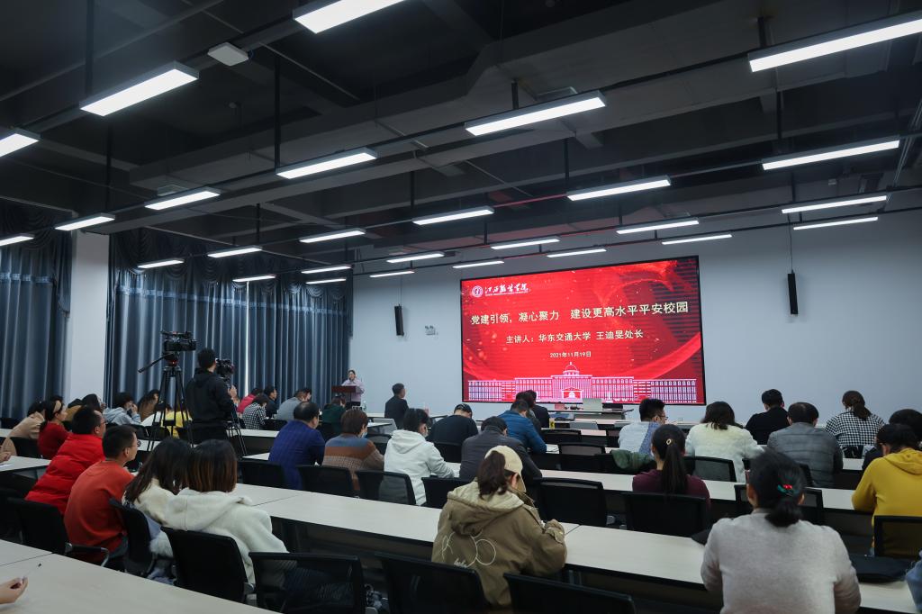 王迪旻处长以《党建引领凝心聚力,建设更高水平平安校园》为题,以“全国党建工作样板支部——华东交通大学保卫(武装)党支部”为例,结合党的十九届六中全会精神,从理论武装、内涵建设、硬件保障和党员辐射带动等方面,抓住“围绕中心抓党建,抓好党建促发展”这一主线,就如何打造党建与平安校园建设相融合的“样板支部”传授了经验做法。