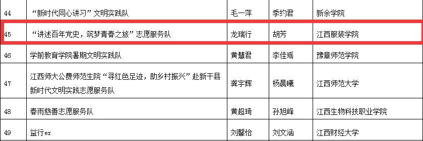 (新闻中心讯)近日,江西省教育厅、省文明办发布《关于公布2021年全省高校大学生暑期文明实践志愿行动评选结果的通知》,我校三支队伍“推普助力乡村振兴,聚力共筑中国梦”、“党史学习践初心志愿服务暖人心”、“‘讲述百年党史,筑梦青春之旅’志愿服务队”获评“优秀志愿服务团队”荣誉称号,龚琦、况亚萍、龙瑞行三位教师获评优秀指导教师荣誉称号。