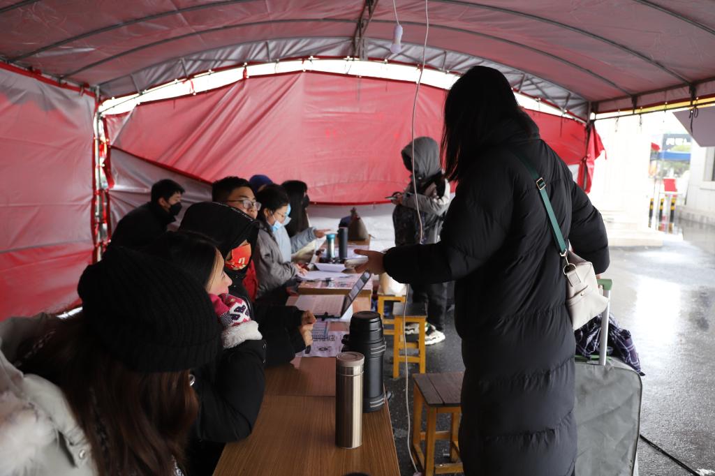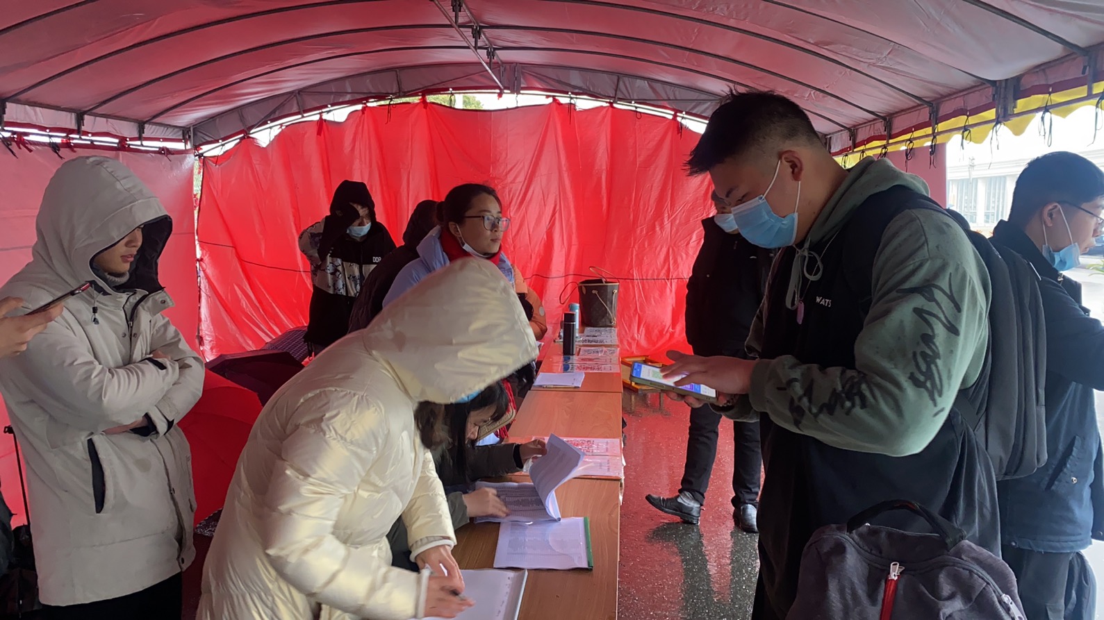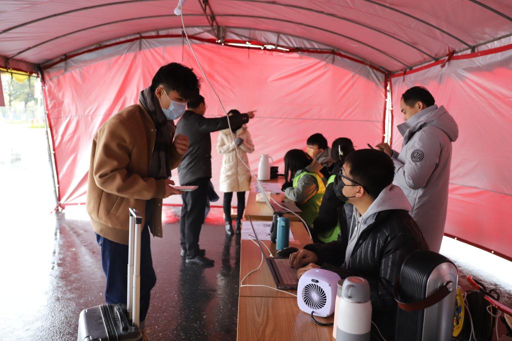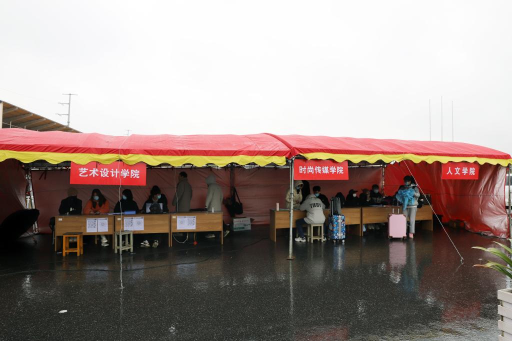 学工人员和志愿者冒着春雨寒风迎接同学们的到来