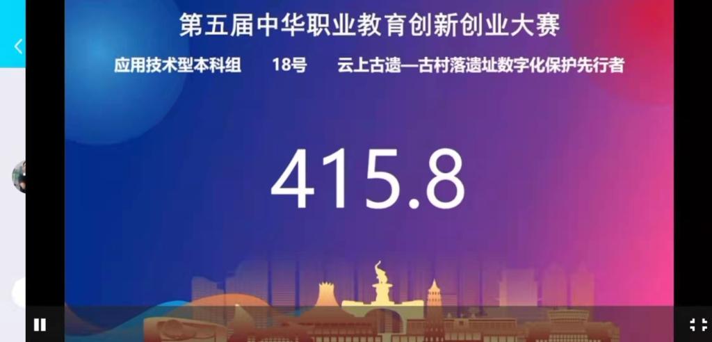 2021年12月28-30日,由中华职业教育社主办,教育部、人力资源和社会保障部共同指导的第五届中华职业教育创新创业大赛全国总决赛圆满落幕,我校教师沈新建指导,晁阳、林浩升、杜海林、毛凤君等同学参赛的项目《云上古遗——古村落遗址数字化保护先行者》在众多项目中力破重围,荣获全国应用技术型本科组三等奖,这是我校在全国创新创业赛事中所取得的又一成果。