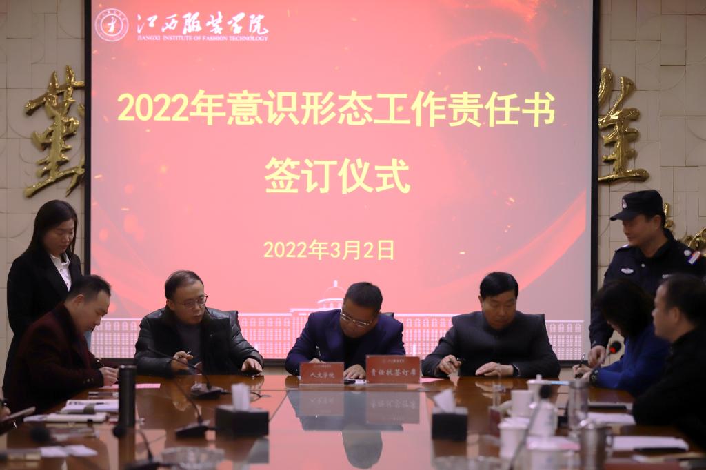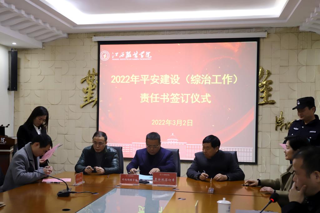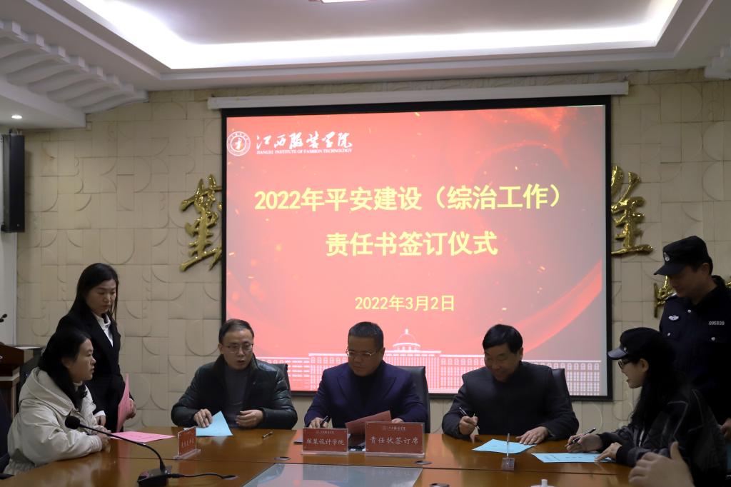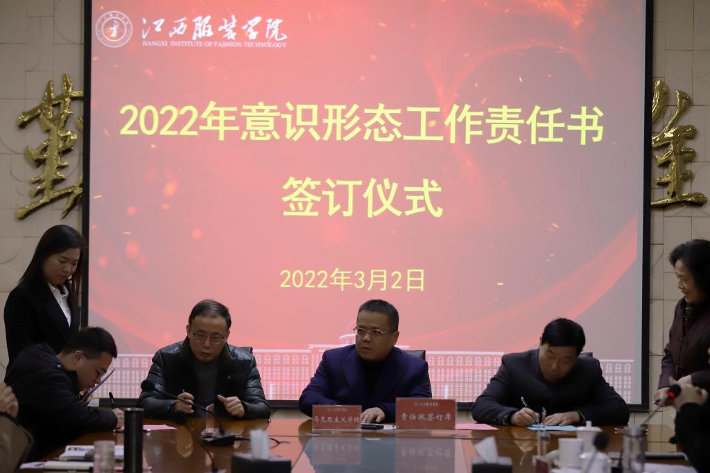随后,举行了江西服装学院2022年平安建设工作和意识形态工作责任书签订仪式。校理事长涂顺强、党委书记陈付龙、校长薛家宝共同与各二级学院党政负责人签订了责任书。