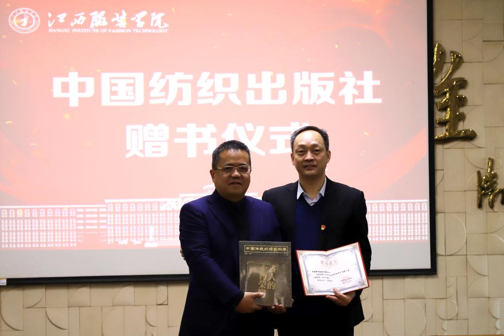 随后,中国纺织出版社有限公司董事长郑伟良赠予《中国传统织绣·实物考》,江西服装学院涂顺强理事长接受捐赠并授予捐赠证书。