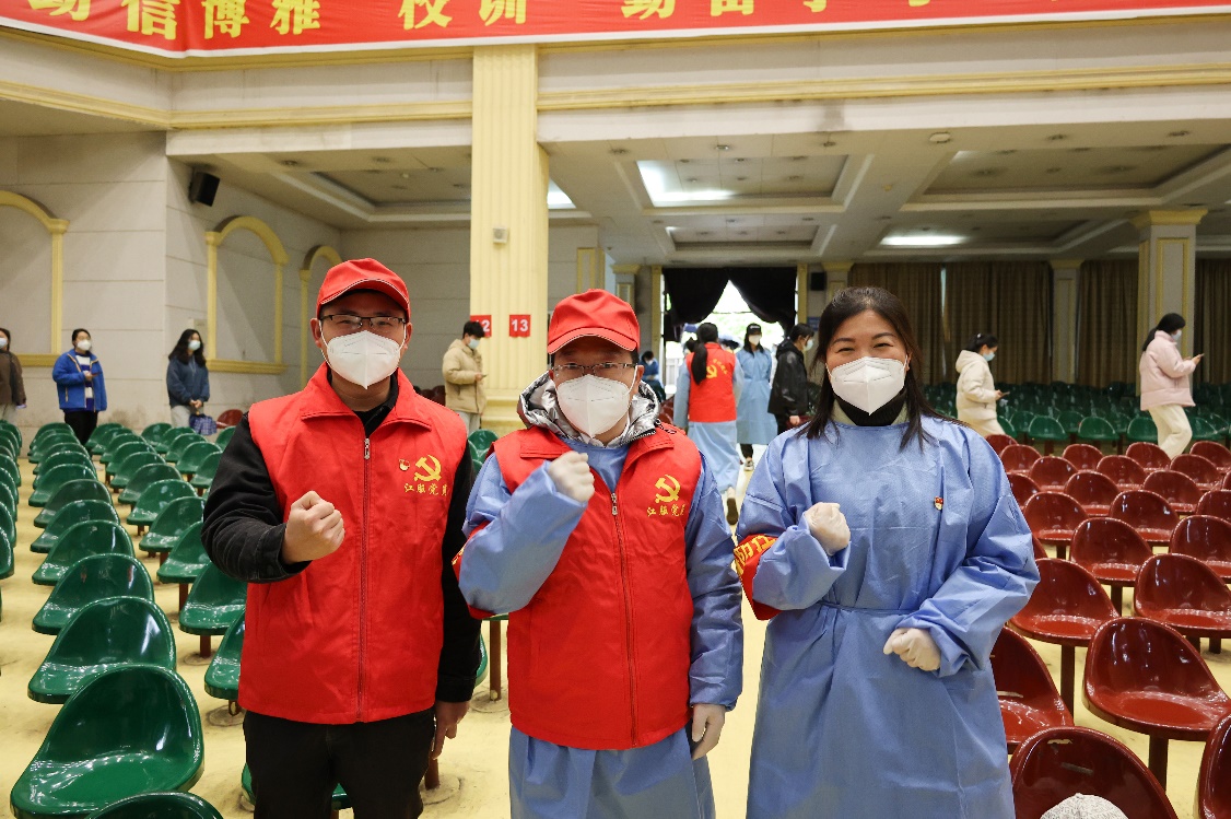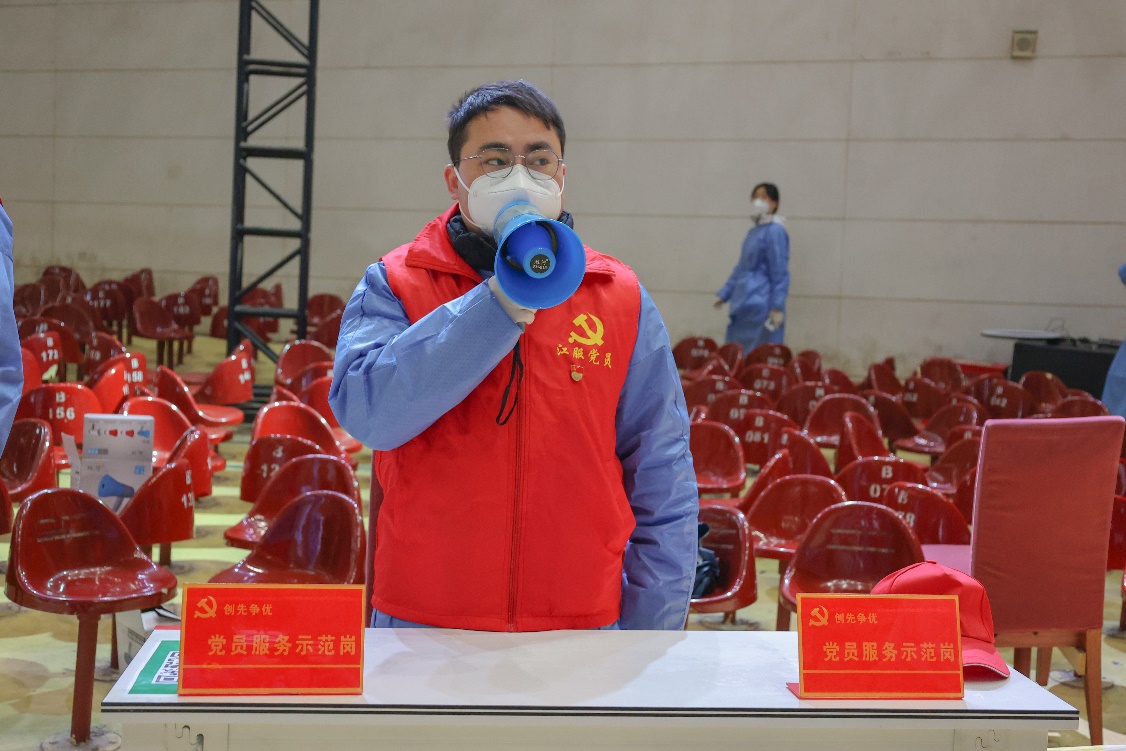 在核酸检测现场,一个个身着“江服党员”红色马甲,佩戴红袖章的的党员志愿者冲锋在前,值守在学校疫情防控一线,他们配合学校疫情防控办的指挥和安排,勇担责任,高质量完成所承担各项工作,搭建帐篷,协助布置检测点,引导前来检测的师生排队扫描“昌通码”,录入个人身份信息,维持秩序、值守卡点、宣传防疫知识、为师生解答各类问题,提醒大家做好个人防护,料峭春雨中,党员志愿者们用汗水和忙碌的身影践行党员的初心使命,践行为人民服务的承诺。以实际行动践行“我为群众办实事”,在疫情防控中充分发挥基层党组织战斗堡垒作用和党员先锋模范作用,让党旗在人民群众最需要的地方飘扬,全力以赴打赢打好疫情防控阻击战。