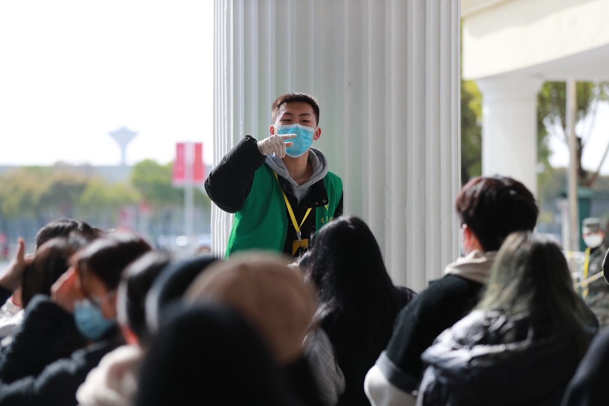 这次核酸检测的志愿服务工作主要由我们的各校级学生组织的成员组成,从团委、学生会、青总会到社团事务中心、艺术团、国旗护卫队,从场外秩序维护到场内健康码的扫描,从第一次核酸检测80名学生志愿者到今天150名志愿者,甚至还有许多同学自主报名参与进来的,我们志愿者的工作热情有增无减,工作效率越来越高!他们真正用行动诠释“江服骨干,敢挑重担!”