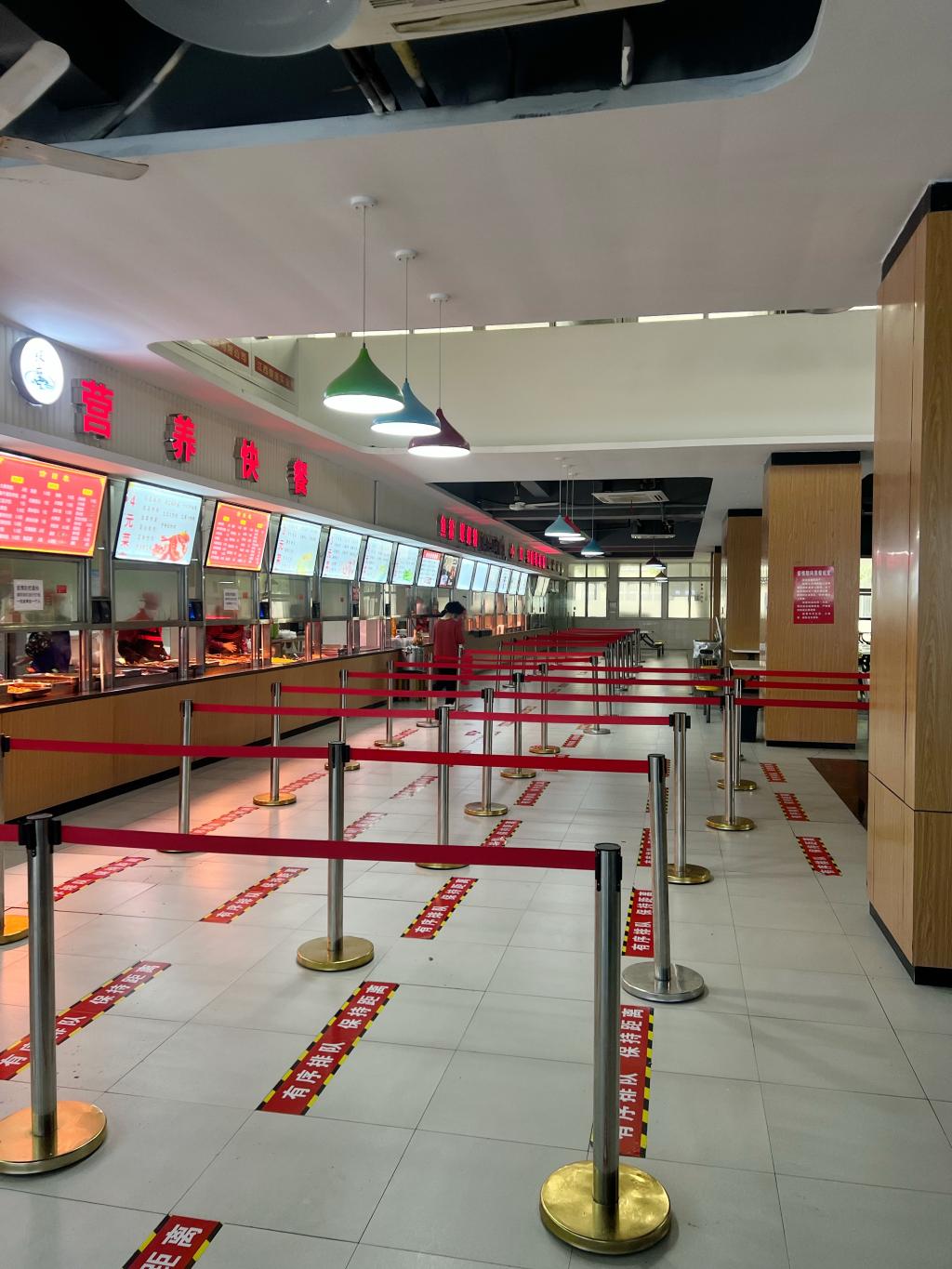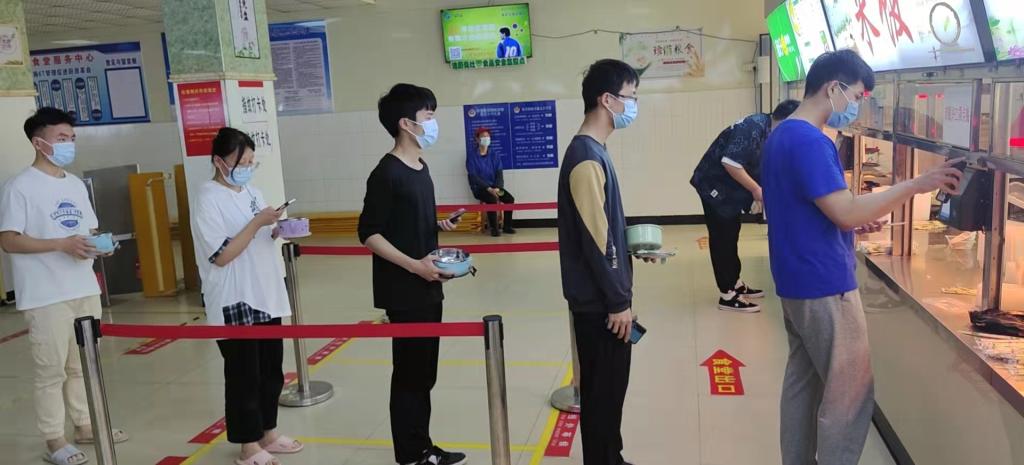后勤保障处加强对食堂、店铺就餐进出人员的温度检测、佩戴口罩的管理工作,认真推行师生错峰、错时就餐政策,保持购餐排队一米线安全距离,暂停堂食供应,预防密集就餐风险。