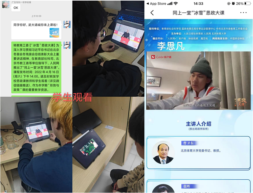 4月16日,人文学院组织各班宣传委员观看了人民网在线推出的“同上一堂‘冰雪’思政大课”参加观看还有人文学院全体学生。