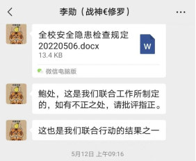 四是加强整改,明确安全责任单位主体职责。通过排查,各检查组记录整理发现的安全隐患问题,校综治办牵头制定整改措施,并逐一与安全责任单位落实整改要求和时间。各部门迅速响应,加强了管理力量、完善了管理规定、及时修缮了设施设备,少数因客观原因来不及整改的也正在积极协调,力求在最短的时间内解决问题。