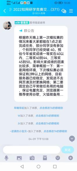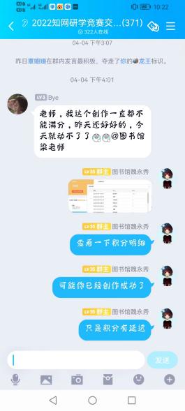 知识人生,知网相伴。为迎接第27个“世界读书日”,深入开展全民阅读活动,4月1日——4月30日,由江西省高等学校图书情报工作委员会、中国知网江西分公司举办了第二届江西省高校图书馆“知网研学”杯积分挑战赛。在为期一个月的活动中,全校师生通过阅读、做笔记、笔记汇编、上传文件、知识创作等一系列操作,不仅熟知了知网海量专业知识资源,掌握了如何使用知网研学平台助力学习科研,也在潜移默化中提升了广大师生的信息素养。指导老师魏永秀在接到这个活动的第一时间先熟悉了比赛规则和操作流程,同时借助图书馆网站、微信公众号、QQ群等途径广泛宣传,并及时与学生工作处联系,共同商议活动宣传事宜,并取得了十分显著的效果。为保证参赛师生能顺利参赛并尽快熟悉比赛规则,魏老师提前录制操作视频供参赛者学习。在比赛过程中,魏老师也是不分昼夜,为学生答疑解惑,总是在第一时间回答学生的问题,安抚学生的情绪。为学生能在最后一天的比赛中取得佳绩,魏老师还安排了每周一次模拟,让学生感受比赛氛围。学生的踊跃参与、积极配合与指导老师的科学指导正是此次活动获得圆满成功的关键所在。