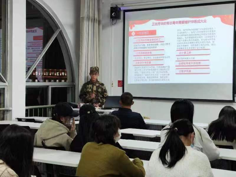 我校退役士官商学院李旭东结合自身经历,就参军意义、物质和精神收获、人生改变多方面进行了交流,鼓励毕业生们积极响应国家号召,踊跃报名参军。