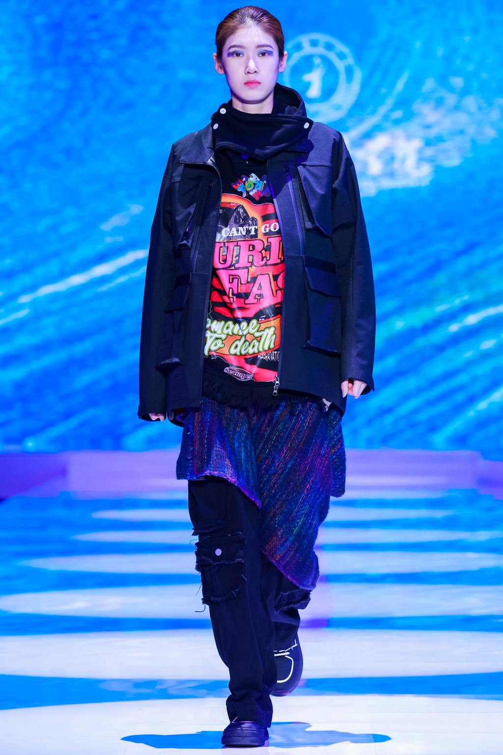本场发布会以“赤之赋.”为主题,灵感来自红色文化与新潮概念的碰撞,采取了多重元素重塑,打破原有的束缚,寻求色彩与灵感的冲突、面料与廓形的对撞以及传统与现代的衔接。整场发布会讲述了新生命从萌芽到成熟,最后涅盘重生焕发新生的故事,作品中的生命绿、成熟灰和力量红正是“新长征,再出发”现代精神的新诠释。