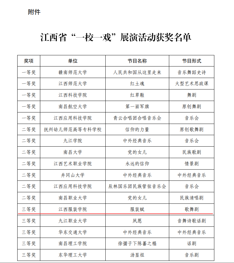 近日,江西省教育厅公布江西省“一校一戏”展演活动获奖名单,我校大型原创音乐舞台剧《服装赋》荣获三等奖。
