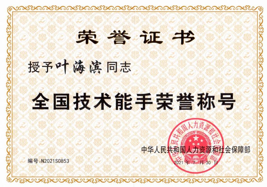 喜报||我校教师叶海滨被人社部授予“全国技术能手”称号