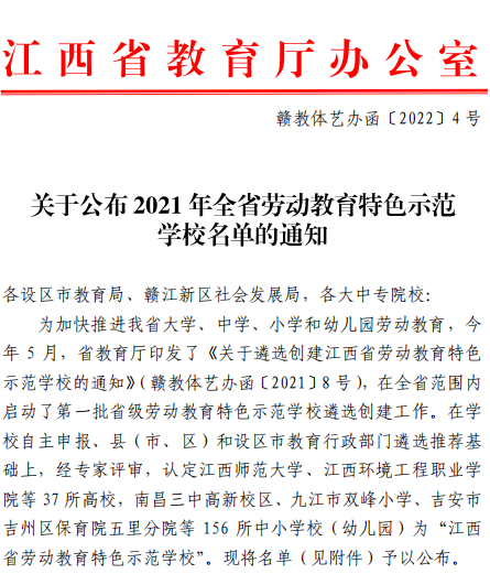 近日,江西省教育厅发布了《关于公布2021年全省劳动教育特色示范学校名单的通知》(赣教体艺办函〔2022〕4号),共37所高校遴选为全省劳动教育特色示范学校,我校位列其中。省教育厅劳动教育特色示范学校名单的通知文件近年来,为全面贯彻落实《中共中央国务院关于全面加强新时代大中小学劳动教育的意见》《大中小学劳动教育指导纲要(试行)的通知》等文件精神与要求,我校高度重视劳动教育,制定了《江西服装学院关于加强新时代...