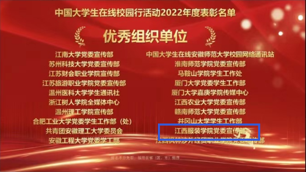 1月10日,教育部中国大学生在线在北京召开2022年度校园号建设暨校园网通工作年会。会上发布了2022年度校网通站及校园行活动表彰名单,我校获两项荣誉奖项。校党委宣传部荣获“校园行优秀组织单位”“校园行新星单位”。我校中国大学生在线校园网络通讯站自2020年11月成立以来,在学校党委的领导下,我校党委宣传部大学生记者团作为中国大学生在线江西服装学院网络通讯站积极响应,持续深化与教育部中国大学生在线的共建工作,...